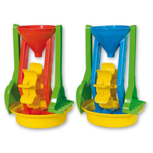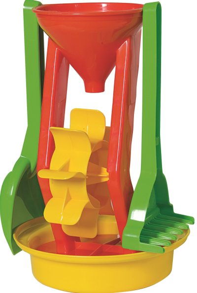 4dílná sada na písek, vyrobená z kvalitních plastů v Itálii. Obsahuje: mlýnek s jedním lopatkovým kolem výšky 25 cm, sítko o průměru 17 cm, lopatku a hrabičky. Sada: výška 26 cm, váha 0,34 kg. Doporučený věk od 12 měsíců. Výrobce, italská firma Androni Giocattoli sídlící nedaleko Milána, se specializuje na výrobu plastových hraček na písek a zahradu a také stavebnic UNICO Plus již od roku 1974. Jejím mottem je heslo: Androni Toys: Kvalita vyrobená v Itálii. Používané plasty jsou pevné, ale zároveň pružné a při běžném hraní nedochází k jejich praskání. Vydrží i větší zátěž a proto jsou výrobky vhodné i do školek, kde téměř denně procházejí zatěžkávací zkouškou.