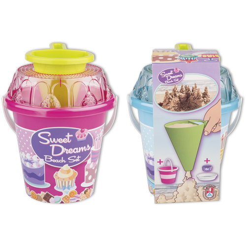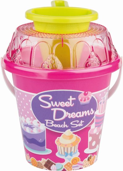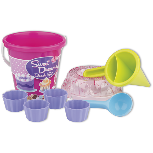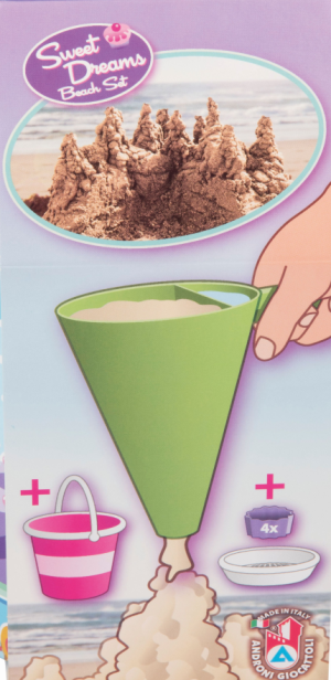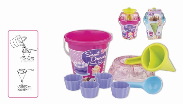 8dílná sada na písek, vyrobená z kvalitních plastů v Itálii. Obsahuje: Kyblík, průhledné sítko ve tvaru dortu, lopatku, 4 tvořítka ve tvaru bábovky a jeden dekoraterských trychtýř pro míchání písku a vody a vytáření kreativních muffinů a jiných výtvorů. Kyblík: průměr 17 cm výška 16 cm. Sada: výška 22,5 cm, váha 0,43 kg. Doporučený věk od 12 měsíců.