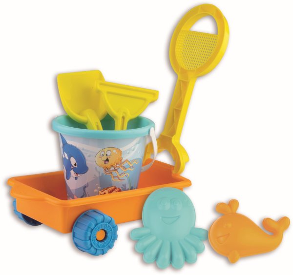 6dílná sada na písek, vyrobená z kvalitních plastů v Itálii. Obsahuje: Vozík s rukojetí, jejíž konec lze využít jako sítko, kyblík, lopatku, hrabičky a tvořítka ve tvaru chobotnice a velryby. Rozměry vozíku: 27 x 22 x 10 cm (d x š x v), délka rukojeti 30 cm, kyblík o průměru 17 cm a výšce 16 cm. Sada: 30 x 22 x 27 cm (d x š x v). Váha: 0,60 kg. Doporučený věk od 12 měsíců.