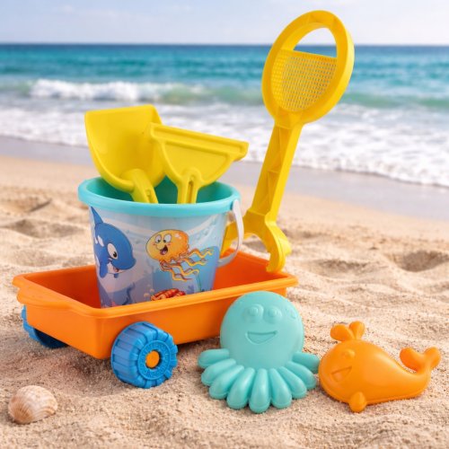 6dílná sada na písek, vyrobená z kvalitních plastů v Itálii. Obsahuje: Vozík s rukojetí, jejíž konec lze využít jako sítko, kyblík, lopatku, hrabičky a tvořítka ve tvaru chobotnice a velryby. Rozměry vozíku: 27 x 22 x 10 cm (d x š x v), délka rukojeti 30 cm, kyblík o průměru 17 cm a výšce 16 cm. Sada: 30 x 22 x 27 cm (d x š x v). Váha: 0,60 kg. Doporučený věk od 12 měsíců.