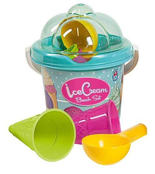 5dílná sada na písek, vyrobená z kvalitních plastů v Itálii. Obsahuje: Kyblík s víkem ve tvaru zmrzlinového poháru, kopečkovač na zmrzlinu a 2 zmrzlinové kornoutky. Kyblík: průměr 13 cm, výška 11 cm. Sada: výška 16 cm, váha 0,26 kg. Doporučený věk od 10 měsíců.