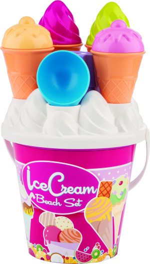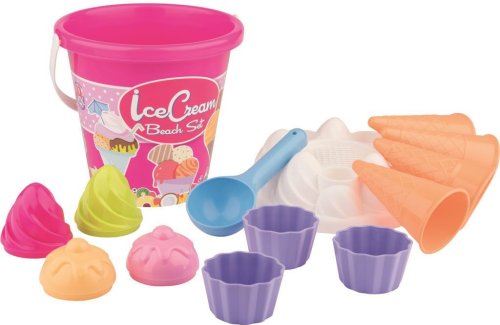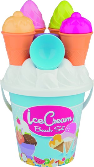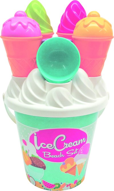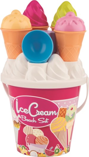 Souprava obsahuje: kyblík s víčkem, naběračku a formičky (11 ks) ve tvaru zmrzlinových kornoutů a kopečků.