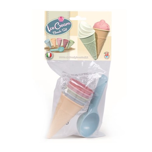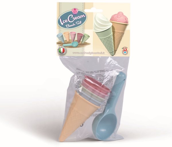 6dílná sada tvořítek na písek - zmrzlina. Vyrobeno v Itálii z kvalitních plastů. Obsahuje pět kornoutků a kopečkovač na zmrzlinu. Baleno v sáčku o rozměrech 15 x 31 cm. Váha: 0,114 kg. Doporučený věk od 10 měsíců.