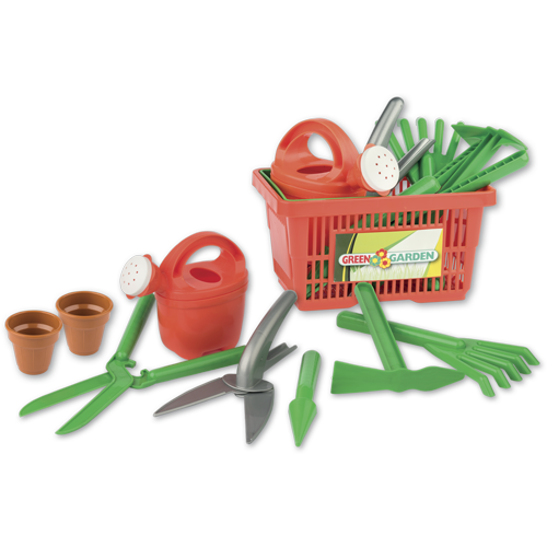 9dílná sada zahradnického nářadí v praktickém košíku pro malé zahradníky, vyrobená z kvalitních plastů v Itálii. Set obsahuje: Košík s rukojetí, konvičku 0,5 litru, 2 malé zahradní truhlíky, dva druhy zahradních nůžek, důlkovač, motyčku a hrabičky. Sada: 23 x 16 x 23 cm (d x š x v), váha 0,45 kg. Doporučený věk od 12 měsíců.