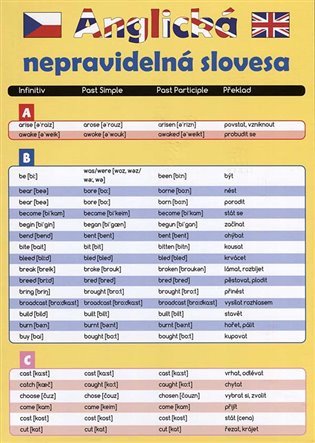 Všechna nepravidelná anglická slovíčka, v jedné rozkládací tabulce, která se vejde do každého sešitu, či notýsku ! Tento malý pomocník se hodí každému angličtináři, bez ohledu na to, jestli je to školák nebo ne!