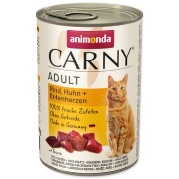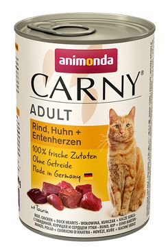 Konzerva s hovězím masem, kuřecím masem a kachními srdíčky. Kompletní krmivo pro dospělé kočky.