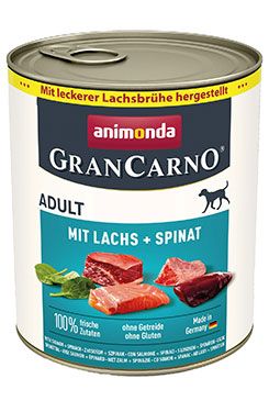 Animonda GranCarno Adultoptimálně vyvážené a chutné krmivo pro dospělého psa ve věku 1–6 letvyrobeno z čerstvého masa a vnitřností - s viditelnými masovými kouskyvynikající masová chuť - nefalšovaný požitekbez obilovin, bez lepku, bez sóji, bez cukrubez umělých barviv a konzervačních látekSložení: 52 % vepřového masa (srdce, játra, plíce, maso), 29 % vývar z lososa, 12 % losos, 4 % špenát, minerální látky, světlicový olejAnalytické složky: protein 10,5 %, obsah tuku 5 %, vláknina 0,4 %, popel 2,5 %, vlhkost 79 %Nutriční doplňkové látky (kg): 200 IU vitaminu D3, 1,4 mg monohydrát síranu manganatého, 25 mg síranu zinečnatého, monohydrátu, 0,5 mg síranu měďnatého(II) pentahydrátuHmotnost: 800 g