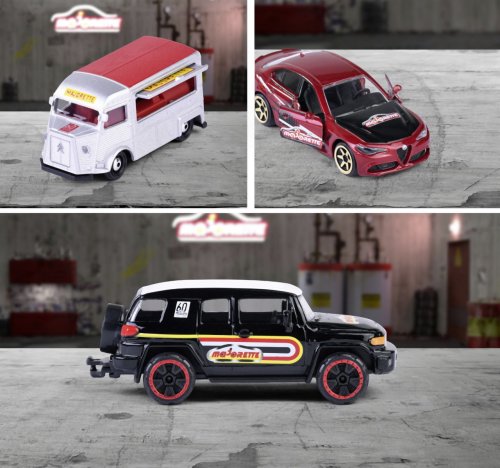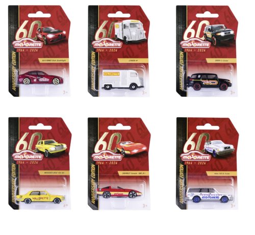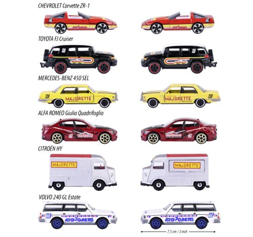 Prémiové kovové autíčko k oslavě výročí 60. let Majorette na volnoběh. S více otevíratelnými částmi (dveře/kapota).V kolekci je 6 druhů autíček: Citroen HY, Mercedes-Benz 450 SEL, Volvo 240 GL Estate,Chevrolet Corvette 1990 ZR-1, Toyota FJ Cruiser, Alfa Romeo Giulia Quadrifoglio. Délka autíčka 7,5 cm. V měřítku 1:64.
