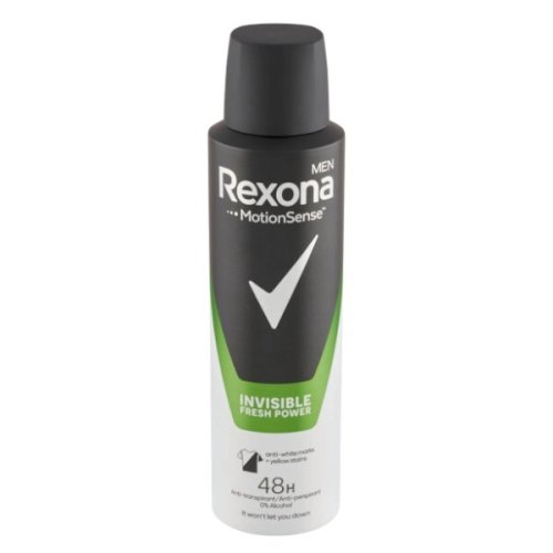 Tento antiperspirant pro muže spolehlivě bojuje proti žlutým skvrnám na bílém oblečení a bílým stopám na černém oblečení. Obsahuje technologii MotionsenseTM, která se postupně uvolňuje a zachová po celý den maximální pocit svěžesti. Rexona MEN antiperspirant sprej Invisible Fresh & Power je dermatologicky testovaný, poskytuje 48hodinovou ochranu proti pocení a zápachu a jeho složení neobsahuje alkohol.