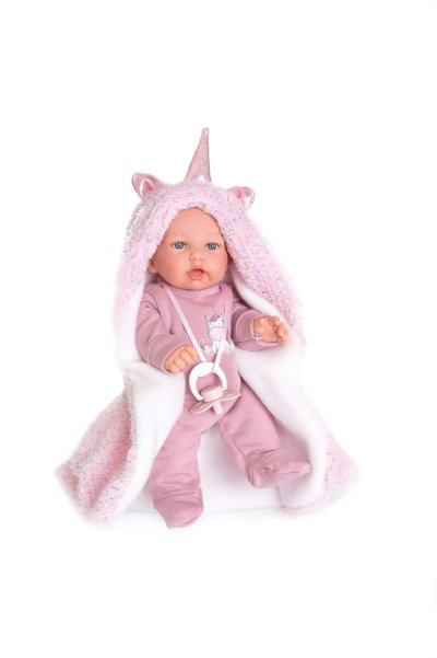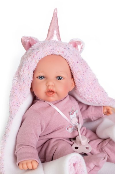 Mluvící, ručně vyrobená realistická španělská panenka. Po zatlačení na bříško začne panenka říkat „mama“, „papa“ a vydávat reálný zvuk smějícího se dítěte. Panenka má měkké látkové tělo, hlava a končetiny jsou vyrobené z kvalitního měkčeného vinylu. Oblečení některých panenek bylo vyrobeno z organické bavlny, která zaručuje výrobu z ručně sbírané, ekologicky bez chemického ošetření pěstované bavlny. Firma Antonio Juan klade velký důraz na ekologii a proto jako první využívá v tomto odvětví zmíněnou bavlnu. Velikost 27 cm. Baleno v dárkové krabici. Doporučený věk od 3 let. Součástí balení je 3 x knoflíková baterie LR44 s návodem na její výměnu. Baterie jsou spotřební zboží a proto jejich vybití není důvodem k reklamaci panenky.