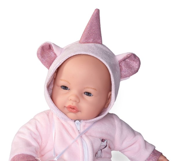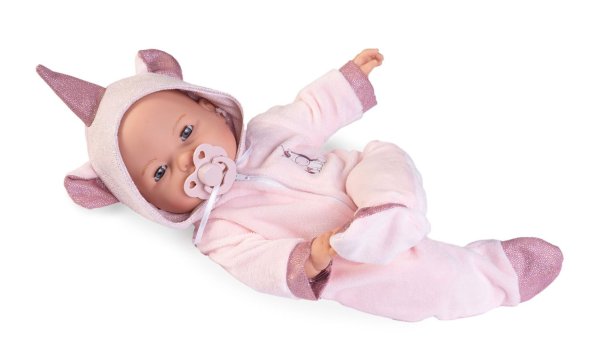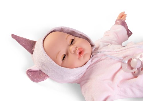 Mrkací a plačící, ručně vyrobená španělská panenka - miminko, reagující na magnetický dudlík. Po vytažení dudlíku z úst začne panenka říkat „mama“, „papa“ a vydávat reálný zvuk plačícího dítěte, který lze utišit dudlíkem. Panenka má měkké látkové tělo, hlava a končetiny jsou vyrobené z kvalitního měkčeného vinylu. Oblečení některých panenek bylo vyrobeno z organické bavlny, která zaručuje výrobu z ručně sbírané, ekologicky bez chemického ošetření pěstované bavlny. Firma Antonio Juan klade velký důraz na ekologii a proto jako první využívá v tomto odvětví zmíněnou bavlnu. Velikost 37 cm. Baleno v dárkové krabici. Doporučený věk od 3 let. Součástí balení je 3 x knoflíková baterie LR44 s návodem na její výměnu. Baterie jsou spotřební zboží a proto jejich vybití není důvodem k reklamaci panenky.