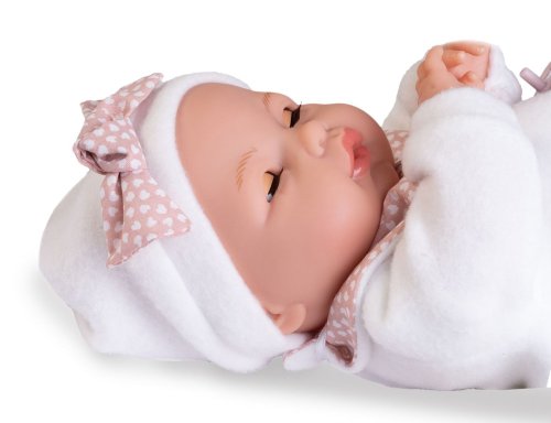 Mrkací a plačící, ručně vyrobená španělská panenka - miminko, reagující na magnetický dudlík. Po vytažení dudlíku z úst začne panenka říkat „mama“, „papa“ a vydávat reálný zvuk plačícího dítěte, který lze utišit dudlíkem. Panenka má měkké látkové tělo, hlava a končetiny jsou vyrobené z kvalitního měkčeného vinylu. Oblečení některých panenek bylo vyrobeno z organické bavlny, která zaručuje výrobu z ručně sbírané, ekologicky bez chemického ošetření pěstované bavlny. Firma Antonio Juan klade velký důraz na ekologii a proto jako první využívá v tomto odvětví zmíněnou bavlnu. Velikost 37 cm. Baleno v dárkové krabici. Doporučený věk od 3 let. Součástí balení je 3 x knoflíková baterie LR44 s návodem na její výměnu. Baterie jsou spotřební zboží a proto jejich vybití není důvodem k reklamaci panenky.