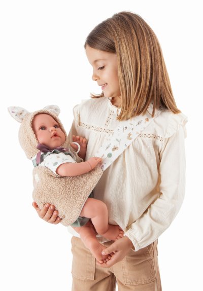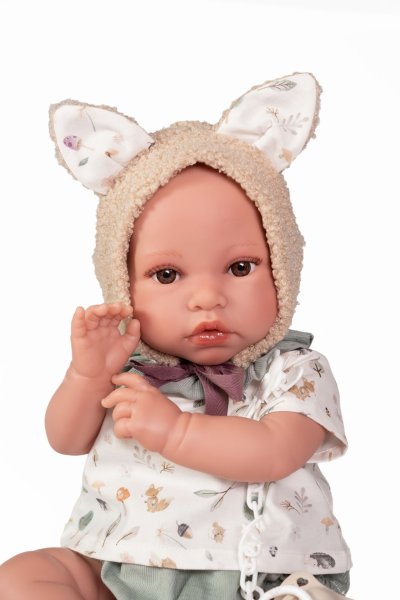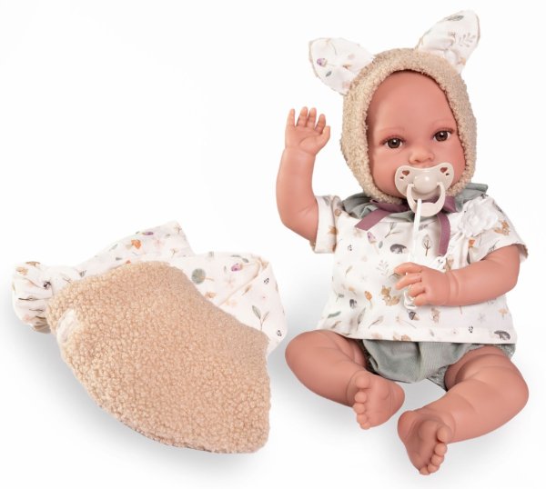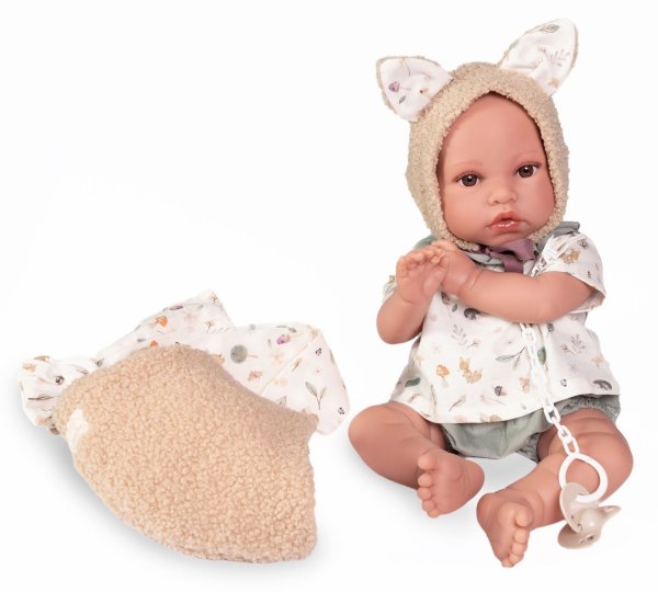 Ručně vyrobená realistická španělská panenka - miminko s realistickými prvky v obličeji a na končetinách. Ruce a nohy jsou k tělu přichycené kloubem s možností polohování, což miminku umožňuje třeba i samostatné sezení bez opory. Panenka má měkké látkové tělo, hlava a končetiny jsou vyrobené ze speciálního měkčeného vinylu, příjemného na dotek. Oblečení některých panenek bylo vyrobeno z organické bavlny, která zaručuje výrobu z ručně sbírané, ekologicky bez chemického ošetření pěstované bavlny. Firma Antonio Juan klade velký důraz na ekologii a proto jako první využívá v tomto odvětví zmíněnou bavlnu. Velikost 42 cm. Baleno v dárkové krabici. Doporučený věk od 3 let.
