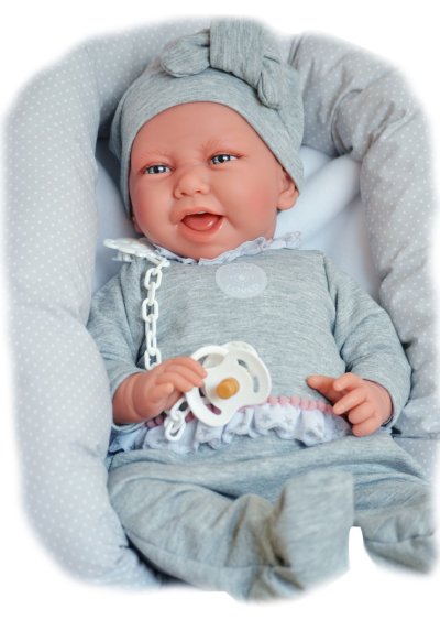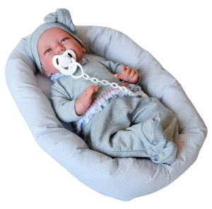 Ručně vyrobená realistická španělská panenka - miminko s realistickými prvky v obličeji a na končetinách. Ruce a nohy jsou k tělu přichycené kloubem s možností polohování, což miminku umožňuje třeba i samostatné sezení bez opory. Panenka má měkké látkové tělo, hlava a končetiny jsou vyrobené ze speciálního měkčeného vinylu, příjemného na dotek. Oblečení některých panenek bylo vyrobeno z organické bavlny, která zaručuje výrobu z ručně sbírané, ekologicky bez chemického ošetření pěstované bavlny. Firma Antonio Juan klade velký důraz na ekologii a proto jako první využívá v tomto odvětví zmíněnou bavlnu. Velikost 42 cm. Baleno v dárkové krabici. Doporučený věk od 3 let.