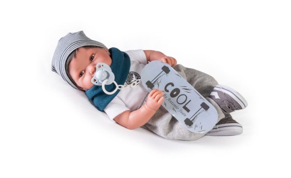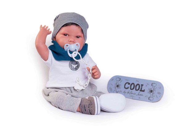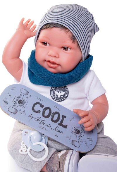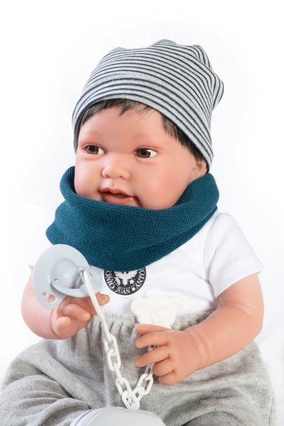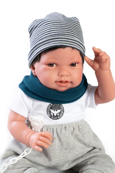 Ručně vyrobená realistická španělská panenka - miminko s realistickými prvky v obličeji a na končetinách. Ruce a nohy jsou k tělu přichycené kloubem s možností polohování, což miminku umožňuje třeba i samostatné sezení bez opory. Panenka má měkké látkové tělo, hlava a končetiny jsou vyrobené ze speciálního měkčeného vinylu, příjemného na dotek. Oblečení některých panenek bylo vyrobeno z organické bavlny, která zaručuje výrobu z ručně sbírané, ekologicky bez chemického ošetření pěstované bavlny. Firma Antonio Juan klade velký důraz na ekologii a proto jako první využívá v tomto odvětví zmíněnou bavlnu. Velikost 42 cm. Baleno v dárkové krabici. Doporučený věk od 3 let.