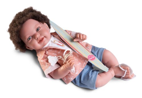 Ručně vyrobená realistická španělská panenka - miminko s realistickými prvky v obličeji a na končetinách. Ruce a nohy jsou k tělu přichycené kloubem s možností polohování, což miminku umožňuje třeba i samostatné sezení bez opory. Panenka má měkké látkové tělo, hlava a končetiny jsou vyrobené ze speciálního měkčeného vinylu, příjemného na dotek. Oblečení některých panenek bylo vyrobeno z organické bavlny, která zaručuje výrobu z ručně sbírané, ekologicky bez chemického ošetření pěstované bavlny. Firma Antonio Juan klade velký důraz na ekologii a proto jako první využívá v tomto odvětví zmíněnou bavlnu. Velikost 42 cm. Baleno v dárkové krabici. Doporučený věk od 3 let.