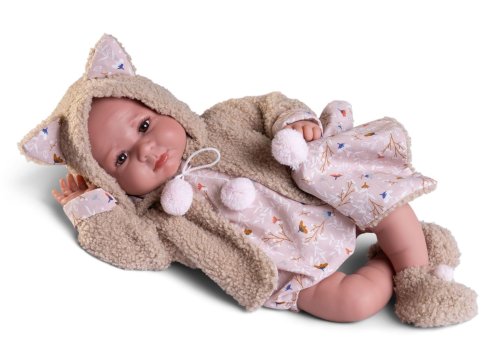 Ručně vyrobená realistická španělská panenka - miminko s realistickými prvky v obličeji a na končetinách. Ruce a nohy jsou k tělu přichycené kloubem s možností polohování, což miminku umožňuje třeba i samostatné sezení bez opory. Panenka má měkké látkové tělo, hlava a končetiny jsou vyrobené ze speciálního měkčeného vinylu, příjemného na dotek. Oblečení některých panenek bylo vyrobeno z organické bavlny, která zaručuje výrobu z ručně sbírané, ekologicky bez chemického ošetření pěstované bavlny. Firma Antonio Juan klade velký důraz na ekologii a proto jako první využívá v tomto odvětví zmíněnou bavlnu. Velikost 42 cm. Baleno v dárkové krabici. Doporučený věk od 3 let.