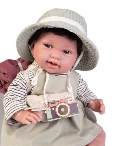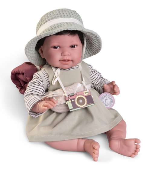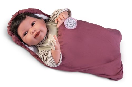 Ručně vyrobená realistická španělská panenka - miminko s realistickými prvky v obličeji a na končetinách. Ruce a nohy jsou k tělu přichycené kloubem s možností polohování, což miminku umožňuje třeba i samostatné sezení bez opory. Panenka má měkké látkové tělo, hlava a končetiny jsou vyrobené ze speciálního měkčeného vinylu, příjemného na dotek. Oblečení některých panenek bylo vyrobeno z organické bavlny, která zaručuje výrobu z ručně sbírané, ekologicky bez chemického ošetření pěstované bavlny. Firma Antonio Juan klade velký důraz na ekologii a proto jako první využívá v tomto odvětví zmíněnou bavlnu. Velikost 42 cm. Baleno v dárkové krabici. Doporučený věk od 3 let.
