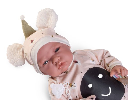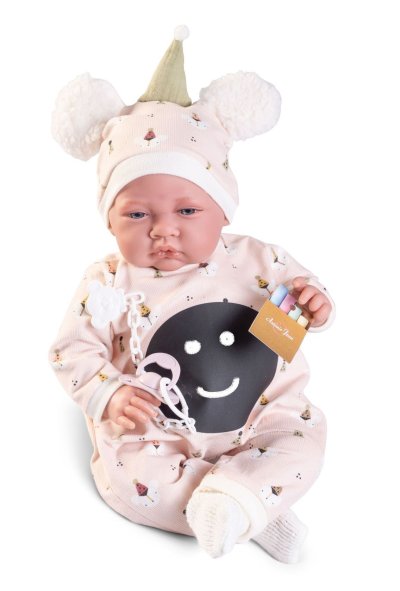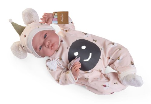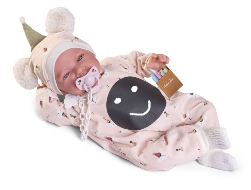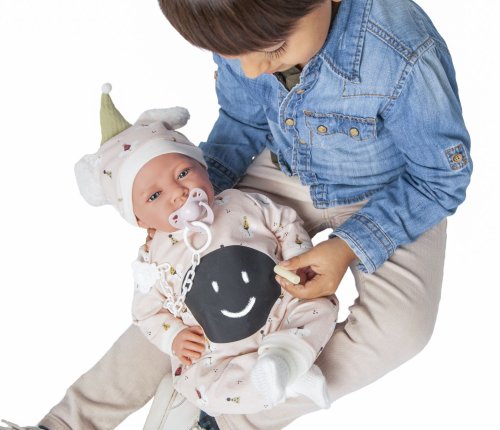 Ručně vyrobená realistická španělská panenka - miminko s realistickými prvky v obličeji a na končetinách. Ruce a nohy jsou k tělu přichycené kloubem s možností polohování, což miminku umožňuje třeba i samostatné sezení bez opory. Panenka má měkké látkové tělo, hlava a končetiny jsou vyrobené ze speciálního měkčeného vinylu, příjemného na dotek. Oblečení některých panenek bylo vyrobeno z organické bavlny, která zaručuje výrobu z ručně sbírané, ekologicky bez chemického ošetření pěstované bavlny. Firma Antonio Juan klade velký důraz na ekologii a proto jako první využívá v tomto odvětví zmíněnou bavlnu. Velikost 42 cm. Baleno v dárkové krabici. Doporučený věk od 3 let.