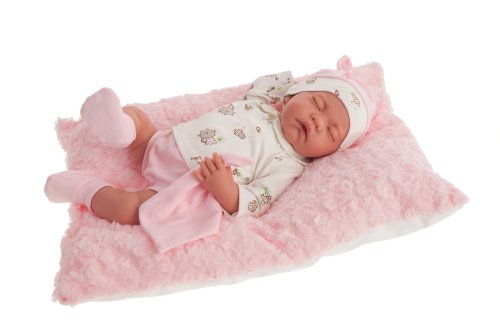 Spící, ručně vyrobená realistická španělská panenka - miminko s realistickými prvky v obličeji a na končetinách. Ruce a nohy jsou k tělu přichycené kloubem s možností polohování, což miminku umožňuje dát si ve spánku třeba ručičky za hlavu. Panenka má měkké látkové tělo, hlava a končetiny jsou vyrobené ze speciálního měkčeného vinylu, příjemného na dotek. Oblečení bylo vyrobeno z organické bavlny, která zaručuje výrobu z ručně sbírané, ekologicky bez chemického ošetření pěstované bavlny. Firma Antonio Juan klade velký důraz na ekologii a proto jako první využívá v tomto odvětví zmíněnou bavlnu. Velikost 42 cm. Baleno v dárkové krabici. Doporučený věk od 3 let.