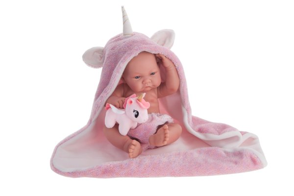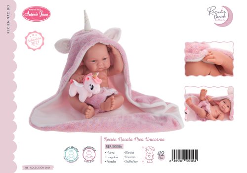 Ručně vyrobená realistická španělská panenka - miminko new born s celovinylovým tělem a realistickým vyobrazením různých miminkovských faldíků a detailů včetně pohlaví. Panenka je vyrobená ze speciálního měkčeného vinylu, velmi příjemného na dotek. Miminko lze koupat, ale je potřeba dát pozor, aby se nenamočily řasy. Odlepené řasy nejsou pak důvodem k reklamaci. Oblečení některých panenek bylo vyrobeno z organické bavlny, která zaručuje výrobu z ručně sbírané, ekologicky bez chemického ošetření pěstované bavlny. Firma Antonio Juan klade velký důraz na ekologii a proto jako první využívá v tomto odvětví zmíněnou bavlnu. Velikost 42 cm. Baleno v dárkové krabici. Doporučený věk od 3 let.