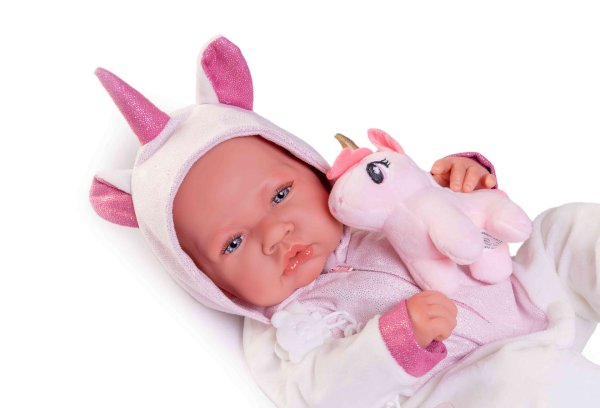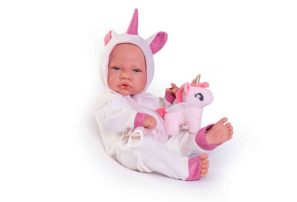 Ručně vyrobená realistická španělská panenka - miminko new born s celovinylovým tělem a realistickým vyobrazením různých miminkovských faldíků a detailů včetně pohlaví. Panenka je vyrobená ze speciálního měkčeného vinylu, velmi příjemného na dotek. Miminko lze koupat, ale je potřeba dát pozor, aby se nenamočily řasy. Odlepené řasy nejsou pak důvodem k reklamaci. Oblečení některých panenek bylo vyrobeno z organické bavlny, která zaručuje výrobu z ručně sbírané, ekologicky bez chemického ošetření pěstované bavlny. Firma Antonio Juan klade velký důraz na ekologii a proto jako první využívá v tomto odvětví zmíněnou bavlnu. Velikost 42 cm. Baleno v dárkové krabici. Doporučený věk od 3 let.