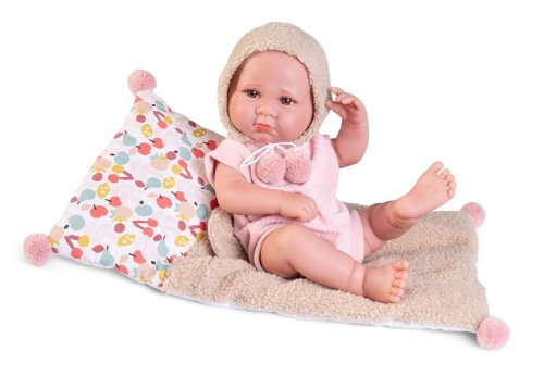 Ručně vyrobená realistická španělská panenka - miminko new born s celovinylovým tělem a realistickým vyobrazením různých miminkovských faldíků a detailů včetně pohlaví. Panenka je vyrobená ze speciálního měkčeného vinylu, velmi příjemného na dotek. Miminko lze koupat, ale je potřeba dát pozor, aby se nenamočily řasy. Odlepené řasy nejsou pak důvodem k reklamaci. Oblečení některých panenek bylo vyrobeno z organické bavlny, která zaručuje výrobu z ručně sbírané, ekologicky bez chemického ošetření pěstované bavlny. Firma Antonio Juan klade velký důraz na ekologii a proto jako první využívá v tomto odvětví zmíněnou bavlnu. Velikost 42 cm. Baleno v dárkové krabici. Doporučený věk od 3 let.
