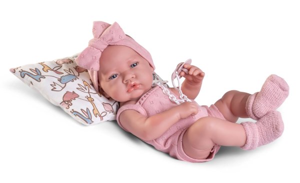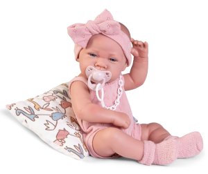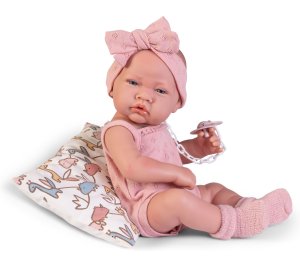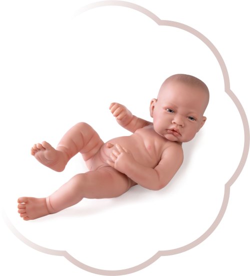 Ručně vyrobená realistická španělská panenka - miminko new born s celovinylovým tělem a realistickým vyobrazením různých miminkovských faldíků a detailů včetně pohlaví. Panenka je vyrobená ze speciálního měkčeného vinylu, velmi příjemného na dotek. Miminko lze koupat, ale je potřeba dát pozor, aby se nenamočily řasy. Odlepené řasy nejsou pak důvodem k reklamaci. Oblečení některých panenek bylo vyrobeno z organické bavlny, která zaručuje výrobu z ručně sbírané, ekologicky bez chemického ošetření pěstované bavlny. Firma Antonio Juan klade velký důraz na ekologii a proto jako první využívá v tomto odvětví zmíněnou bavlnu. Velikost 42 cm. Baleno v dárkové krabici. Doporučený věk od 3 let.