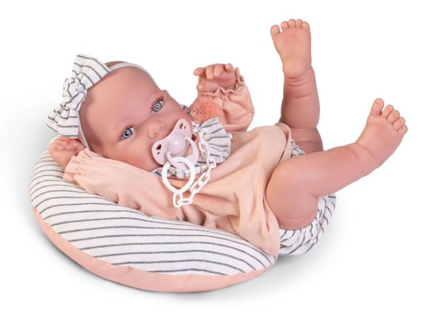 Ručně vyrobená realistická španělská panenka - miminko new born s celovinylovým tělem a realistickým vyobrazením různých miminkovských faldíků a detailů včetně pohlaví. Panenka je vyrobená ze speciálního měkčeného vinylu, velmi příjemného na dotek. Miminko lze koupat, ale je potřeba dát pozor, aby se nenamočily řasy. Odlepené řasy nejsou pak důvodem k reklamaci. Oblečení některých panenek bylo vyrobeno z organické bavlny, která zaručuje výrobu z ručně sbírané, ekologicky bez chemického ošetření pěstované bavlny. Firma Antonio Juan klade velký důraz na ekologii a proto jako první využívá v tomto odvětví zmíněnou bavlnu. Velikost 42 cm. Baleno v dárkové krabici. Doporučený věk od 3 let.