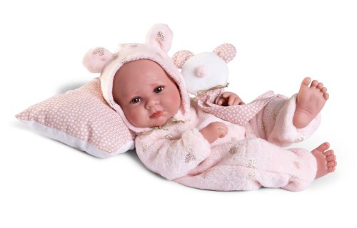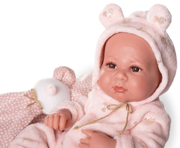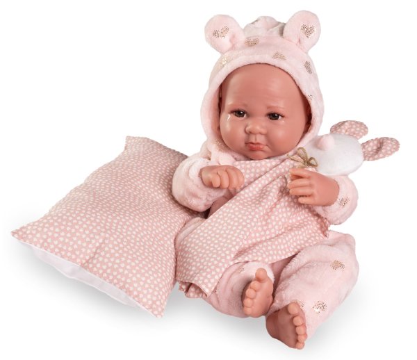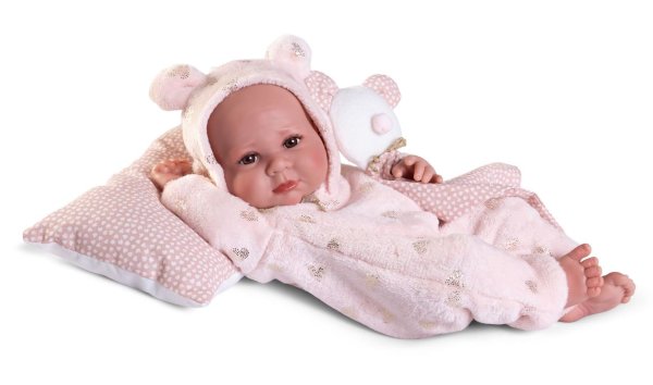 Ručně vyrobená realistická španělská panenka - miminko new born s celovinylovým tělem a realistickým vyobrazením různých miminkovských faldíků a detailů včetně pohlaví. Panenka je vyrobená ze speciálního měkčeného vinylu, velmi příjemného na dotek. Miminko lze koupat, ale je potřeba dát pozor, aby se nenamočily řasy. Odlepené řasy nejsou pak důvodem k reklamaci. Oblečení některých panenek bylo vyrobeno z organické bavlny, která zaručuje výrobu z ručně sbírané, ekologicky bez chemického ošetření pěstované bavlny. Firma Antonio Juan klade velký důraz na ekologii a proto jako první využívá v tomto odvětví zmíněnou bavlnu. Velikost 42 cm. Baleno v dárkové krabici. Doporučený věk od 3 let.