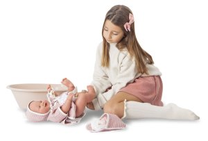 Mrkací a čůrající, ručně vyrobená realistická španělská panenka - miminko new born s celovinylovým tělem a realistickým vyobrazením různých miminkovských faldíků a detailů včetně pohlaví. Panenka je vyrobená ze speciálního měkčeného vinylu, velmi příjemného na dotek. Oblečení některých panenek bylo vyrobeno z organické bavlny, která zaručuje výrobu z ručně sbírané, ekologicky bez chemického ošetření pěstované bavlny. Firma Antonio Juan klade velký důraz na ekologii a proto jako první využívá v tomto odvětví zmíněnou bavlnu. Velikost 42 cm. Součástí balení je i lahvička plnitelná vodou, dvě jednorázové plínky a vanička. Baleno v dárkové krabici. Doporučený věk od 3 let.