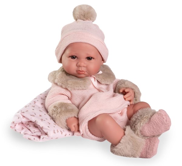 Ručně vyrobená realistická španělská panenka - miminko new born s celovinylovým tělem a realistickým vyobrazením různých miminkovských faldíků a detailů včetně pohlaví. Panenka je vyrobená ze speciálního měkčeného vinylu, velmi příjemného na dotek. Miminko lze koupat, ale je potřeba dát pozor, aby se nenamočily řasy. Odlepené řasy nejsou pak důvodem k reklamaci. Oblečení některých panenek bylo vyrobeno z organické bavlny, která zaručuje výrobu z ručně sbírané, ekologicky bez chemického ošetření pěstované bavlny. Firma Antonio Juan klade velký důraz na ekologii a proto jako první využívá v tomto odvětví zmíněnou bavlnu. Velikost 42 cm. Baleno v dárkové krabici. Doporučený věk od 3 let.