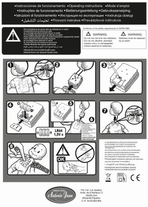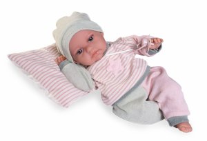 Mluvící, ručně vyrobená realistická španělská panenka - miminko. Po zatlačení na bříško začne panenka vydávat zvuky podobné dětskému žvatlání. Panenka má měkké látkové tělo, hlava a končetiny jsou vyrobené z kvalitního měkčeného vinylu. Oblečení některých panenek bylo vyrobeno z organické bavlny, která zaručuje výrobu z ručně sbírané, ekologicky bez chemického ošetření pěstované bavlny. Firma Antonio Juan klade velký důraz na ekologii a proto jako první využívá v tomto odvětví zmíněnou bavlnu. Velikost 34 cm. Baleno v dárkové krabici. Doporučený věk od 3 let. Součástí balení je 3 x knoflíková baterie LR44 s návodem na její výměnu. Baterie jsou spotřební zboží a proto jejich vybití není důvodem k reklamaci panenky.