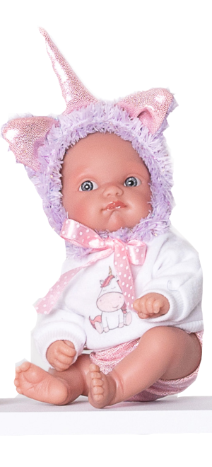 Ručně vyrobená realistická španělská panenka - miminko new born s celovinylovým tělem a realistickým vyobrazením různých miminkovských faldíků a detailů včetně pohlaví. Panenka je vyrobená ze speciálního měkčeného vinylu, velmi příjemného na dotek. Miminko lze koupat. Oblečení některých panenek bylo vyrobeno z organické bavlny, která zaručuje výrobu z ručně sbírané, ekologicky bez chemického ošetření pěstované bavlny. Firma Antonio Juan klade velký důraz na ekologii a proto jako první využívá v tomto odvětví zmíněnou bavlnu. Velikost 21 cm. Baleno v ochranném igelitovém obalu. Doporučený věk od 3 let.