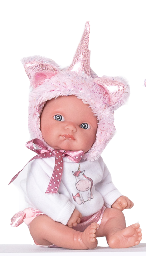 Ručně vyrobená realistická španělská panenka - miminko new born s celovinylovým tělem a realistickým vyobrazením různých miminkovských faldíků a detailů včetně pohlaví. Panenka je vyrobená ze speciálního měkčeného vinylu, velmi příjemného na dotek. Miminko lze koupat. Oblečení některých panenek bylo vyrobeno z organické bavlny, která zaručuje výrobu z ručně sbírané, ekologicky bez chemického ošetření pěstované bavlny. Firma Antonio Juan klade velký důraz na ekologii a proto jako první využívá v tomto odvětví zmíněnou bavlnu. Velikost 21 cm. Baleno v ochranném igelitovém obalu. Doporučený věk od 3 let.
