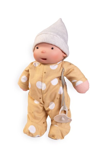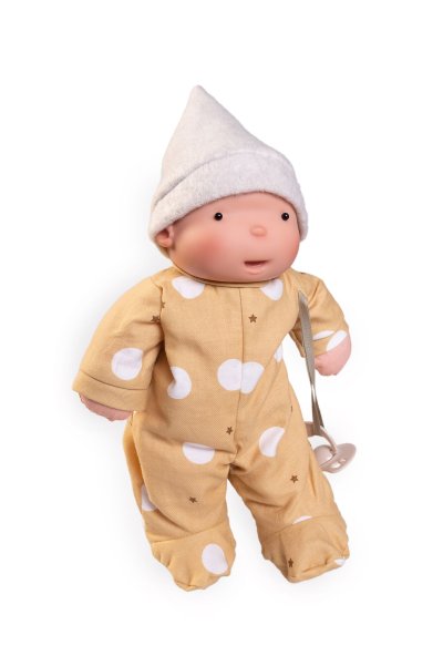 Ručně vyrobená španělská organická panenka s dudlíkem na magnet a měkkým látkovým tělem, vytvořená speciálně pro kojence a batolata. Tělo a končetiny jsou vyrobeny z organické bavlny, hlava ze 100% silikonu. Panenka je plněna měkkým PET vláknem z recyklovaných plastových láhví. Dudlík je vyroben z bio organických materiálů s přírodními pigmenty. Oblečení této panenky bylo vyrobeno z organické bavlny, která zaručuje výrobu z ručně sbírané, ekologicky bez chemického ošetření pěstované bavlny. Firma Antonio Juan klade velký důraz na ekologii a proto jako první využívá v tomto odvětví zmíněnou bavlnu. Velikost 26 cm. Baleno v dárkové krabici. Doporučený věk od 10 měsíců.