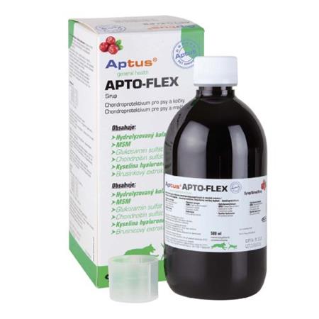 Aptus APTO-FLEX VET sirup je unikátní pětisložkové solubilní chondroprotektivum s kyselinou hyaluronovou a antioxidanty pro psy a kočky. Brusinkový extrakt obsahuje vitamin E, ale navíc obsahuje vitaminy B, C, K, řadu minerálů, jsou známy jeho antioxidační a protinádorové účinky, a je používán také při infekcích močových, orálních a gastrointestinálních. Indikace: Výživa a regenerace chrupavek a vazů v kloubech. Složení: Kyselina hyaluronová, MSM, kolagen, glukosamin sulfát, chondroitin sulfát a antioxidanty (brusinkový extrakt). Preventivní podávání: u velkých a těžkých plemen psů, u sportujících psů, při obezitě, u starších zvířat, u štěňat rychle rostoucích plemen psů - výživa, ochrana a regenerace chrupavek a vazů v kloubech, zlepšení pohyblivosti, prevence artritidy. Terapeutické podávání: Po chirurgických ortopedických zákrocích, při dysplaziích kloubů, při osteoartritidě, při bolestivosti pohybového systému - zrychlení a usnadnění hojení, snížení bolestivosti při pohybu, usnadnění pohyblivosti kloubů, zpomalení progrese artrózy.