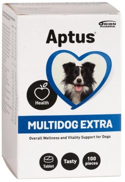 Aptus Multidog Extra Vet je vhodný jako doplněk stravy k podpoře celkového zdraví a vitality vašeho psa. Doplní nezbytné množství vitaminů, minerálů, stopových prvků a aminokyselin a celkově posílí organismus. Je proto vhodný pro psy například v období rekonvalescence, při krmení doma připravovanou stravou, nebo při hypoalergenní a eliminační dietě. Vitamíny jsou ve formě ochucených tablet. Složení: pivovarské kvasnice, želatina (vepřová), stearát hořečnatý (1,35 %). Analytické složky: hrubý protein 30,2 %, surové oleje a tuky 1,3 %, hrubá vláknina 7,3 %, anorganická látka 30 %, vápník 1,4 mg/g, natrium 5,5 mg/g, fosfor 7,7 mg/g, hořčík 2,2 mg/g. Technologické doplňkové látky: mikrokrystalická celulóza. Senzorické doplňkové látky: aromatická složka (játra) 0,04 %. Podávání: Tablety Aptus Multidog Extra s příchutí jater mohou být podávány přímo do tlamy jako pamlsek. Můžete je také rozdrtit a zamíchat do krmení. Někdy může Váš pes potřebovat každodenní suplementaci multivitaminem i tehdy, když žere nedostatečně. Při krmení doma připravovaným krmením je přidávání multivitaminového doplňku stravy nezbytné k dosažení správné nutriční hodnoty krmiva. Multivitaminový doplněk stravy potřebují často také nemocní a stresovaní psi v průběhu rekonvalescence. Aptus Multidog Extra je multivitaminový doplněk stravy ke každodennímu používání k podpoře celkového zdraví a vitality Vašeho psa. Dávkování: 1 tableta na 20 kg hmotnosti psa 1krát denně. V případě zvýšené potřeby 2 tablety na 20 kg hmotnosti 1krát denně po dobu 2 týdnů. Důležité upozornění: Tento přípravek obsahuje vitaminy A, D, a E, které jsou rozpustné v tucích a mohou se shromažďovat v organismu. Jestliže dáváte Vašemu psovi multivitamin, je třeba při krmení počítat s vitaminy A, D, a E v něm obsaženými. Jestliže máte obavy o zdraví svého psa, kontaktujte svého veterináře. Datum spotřeby je vyznačeno na obalu. Uchovávejte při pokojové teplotě (15 - 25°C). Uchovávejte mimo dosah dětí a zvířat.