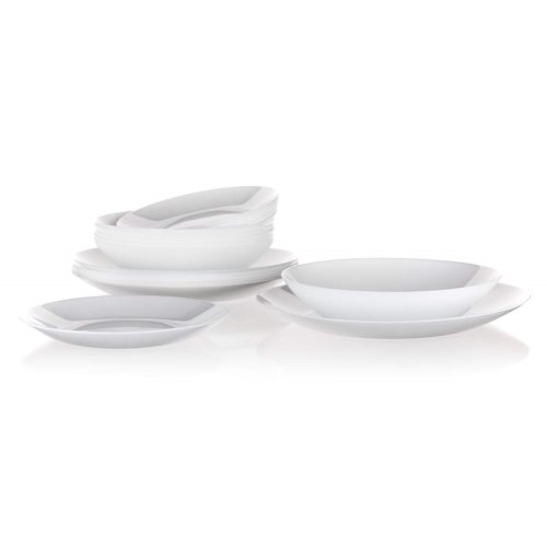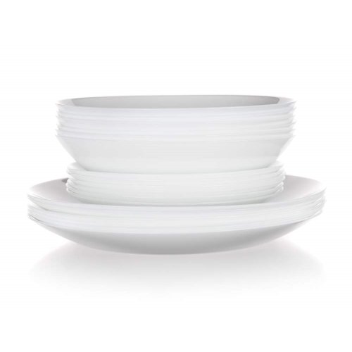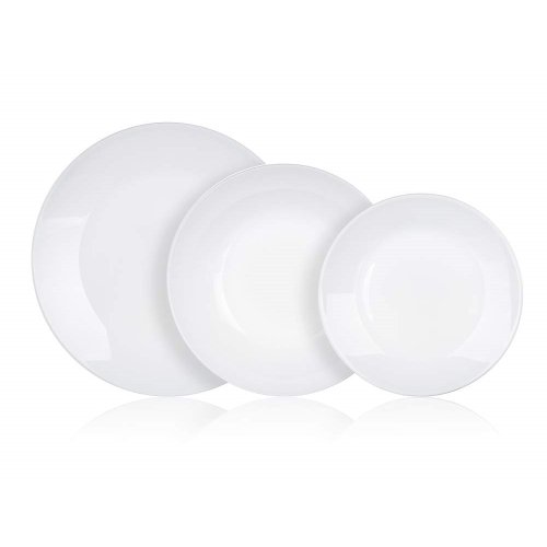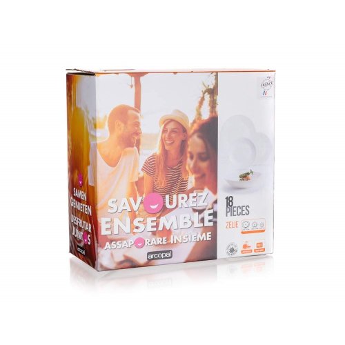 Sada talířů ZELIE 18 ks obsahuje: 6 ks talíř mělký 25 cm, 6 ks talíř hluboký 20 cm a 6 ks talíř desertní 18 cm. Sada talířů je vyrobena z velmi kvalitního skla s vysokou pevností a odolností při používání. Nádobí je vysoce odolné proti poškrábání, otěru, tepelnému šoku, je také neporézní a tudíž zabraňuje usazování bakterií. Udržuje teplotu pokrmů a je 100 % recyklovatelné.