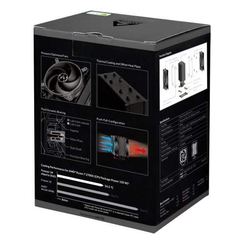 Výkonný chladič pro procesory Intel i AMD je vybaven čtyřmi heatpipe a dvěma ventilátory o velikosti 120 mm s PWM regulací, díky které je možné regulovat rychlost otáček za minutu. Ventilátory disponují kvalitními FDB ložisky, které zajišťují dlouhotrvající bezproblémový chod. K připojení slouží 4-pin PWM konektor.