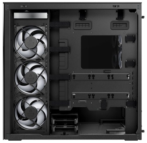 Skříň je vybavena pokročilým chladicím systémem s 5 předinstalovanými A-RGB ventilátory – 2× P12 Pro v zadní části a 3× P14 Pro Reverse na boku. Podporuje radiátory až 360/420 mm v horní i boční pozici, což umožňuje efektivní chlazení i těch nejvýkonnějších procesorů a grafických karet.