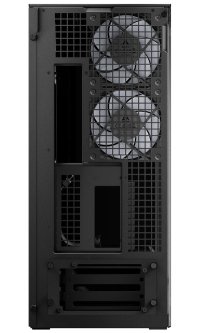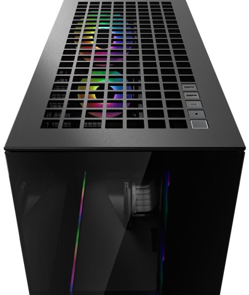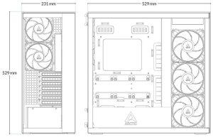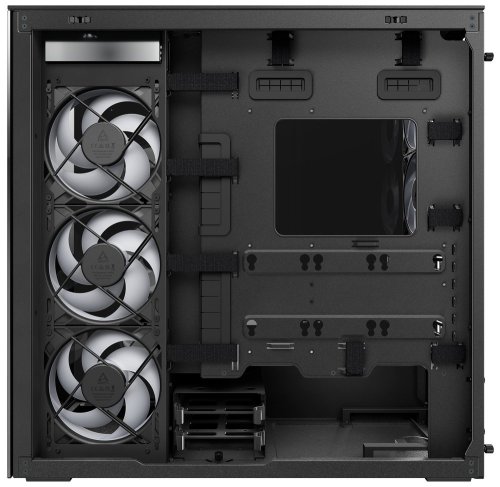 Skříň je vybavena celkem 5 A-RGB ventilátory – dvěma 120mm vzadu a třemi 140mm na boku, které zajišťují optimální chlazení i při vysokém zatížení. Prostorný interiér pojme grafické karty až 482 mm, CPU chladiče do výšky 171 mm a zdroje až 318 mm.