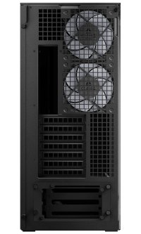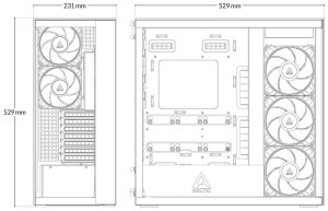 Skříň podporuje instalaci radiátorů až 360/420 mm jak nahoře, tak na boku. Předinstalované ventilátory P12 Pro (vzadu) dosahují 3000 ot./min s průtokem 131 m³/h, zatímco boční P14 Pro Reverse ventilátory nabízejí 166,5 m³/h při 2650 ot./min.