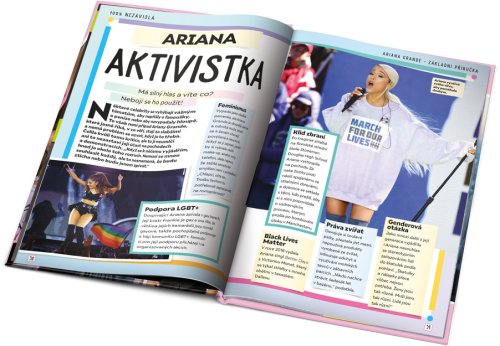 Ariana Grande, zpěvačka, která vyprodává stadiony po celém světě, není jen dlouhovlasá popová princezna – patří k největším světovým hvězdám s impozantním hlasem o rozsahu čtyř oktáv! Její písně zaslouženě dobývají nejvyšší příčky hitparád. Kromě toho je taky módní ikonou, herečkou, obchodnicí, bojuje za práva žen a podporuje lidi s odlišnou sexuální orientací. A přežila teroristický útok na jednom ze svých koncertů! Na prvním místě je pro ni rodina, k níž patří i sedm psů z útulku. Pokud si někdo myslí, že s ní může soupeřit, povězme slovy jedné z jejích skladeb: „Díky, další!“