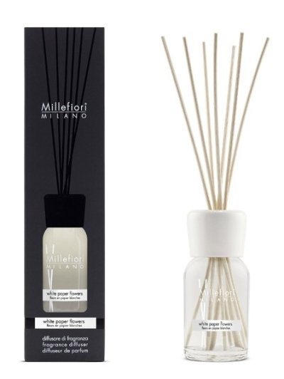 Aroma difuzér Natural Květiny z bílého papíru je svěží a přesto zklidňující vůně, která přináší do domova zářivou atmosféru štěstí. Čistá vůně zelených čajových lístků a bergamotu se mísí s něhou bílých květů a bílé dřevo v základu dodává celé kompozici sametový dotek klidu. Skleněná lahvička je zakončena elegantním keramickým kroužkem. Po vyprchání vůně lze jednodušše koupit pouze náplň a po vymytí lahvičky doplnit libovolnou vůní.