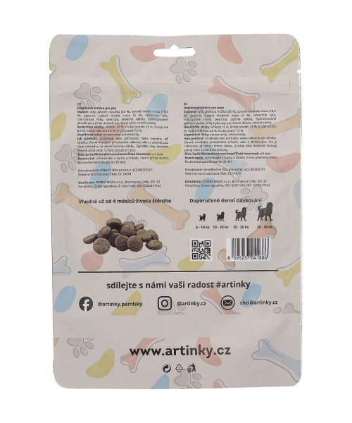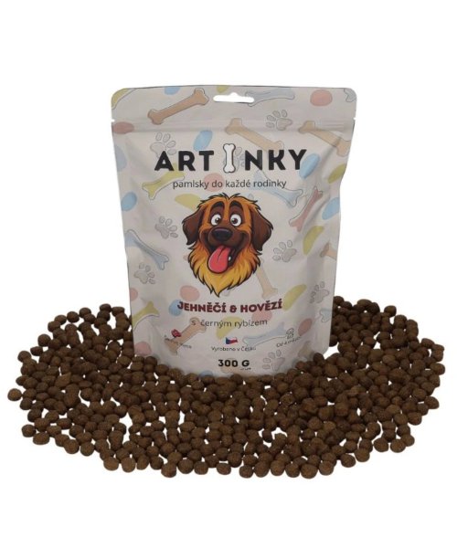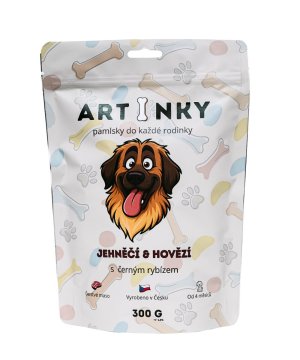 ARTINKY jsou poloměkké pamlsky pro psy vyrobené v České republice. ARTINKY představují kvalitní doplňkové krmivo pro psy, které spojuje vysoký podíl živočišných surovin, jednoduché složení a skvělou chuť. Receptura kombinuje jehněčí a hovězí maso, jemné zdroje vlákniny a černý rybíz pro podporu vitality a imunity.