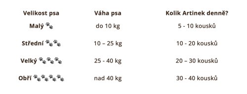 Doporučené podávání: Podávej jako pochoutku nebo odměnu při výcviku. Denní množství přizpůsob velikosti, věku a aktivitě psa. Doporučené dávkování viz tabulka. Není náhradou za kompletní krmivo. Vždy zajisti dostatek čerstvé pitné vody.