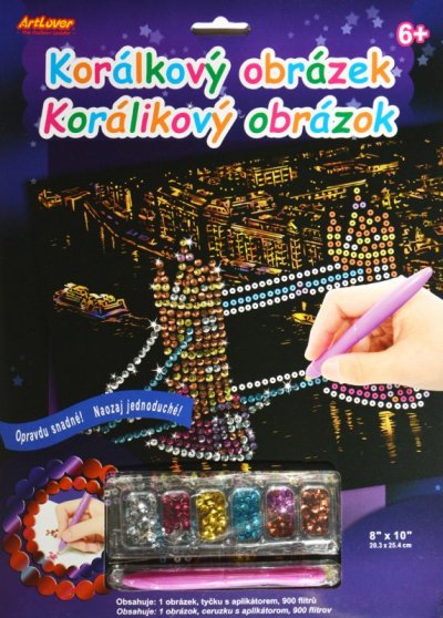 Jednotlivé flitry nabírejte pomocí aplikátoru s přilnavým koncem. Z obrázku odstraňte ochrannou folii, tečky na obrázku lepí. Přenášejte flitry na lepící tečky a druhým koncem aplikátoru je přitlačujte.
