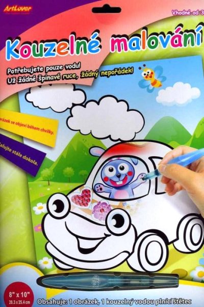 Kouzelné malování vodou zabaví i ty nejmenší výtvarníky. Potřebujete pouze vodu. Díky obrázkům potaženým speciální bílou vrstvou, která po navlhčení zmizí, vykouzlíte rozmanité obrázky, které září všemi barvami. Jakmile obrázek uschne (za několik minut), opět se pokryje bílou barvou - můžete tak malovat stále znovu a znovu...