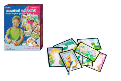 Sada obsahuje 8 kouzelných obrázků. Do tužky nalijte vodu a malujete s ní na obrázek, obrázek se po použití vody objeví a až voda zaschne -cca 3 minuty zase zmizí a můžete malovat znovu. Menší děti mohou používat obyčejný štětec a kelímek s vodou- je to pro ně opravdu zábava a pro rodiče také, protože vodou se nic neušpiní jako s barvami...Vhodné pro děti již od 3 let.